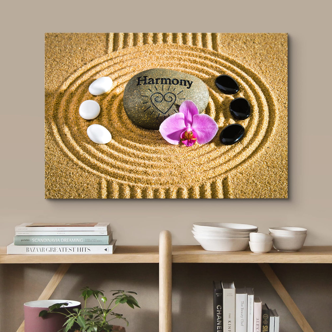 - Q: What type of artwork is featured in this canvas print? A: The canvas print features a Japanese sand garden with massage pebbles and a purple orchid, showcasing nature wilderness photography in a realistic style.