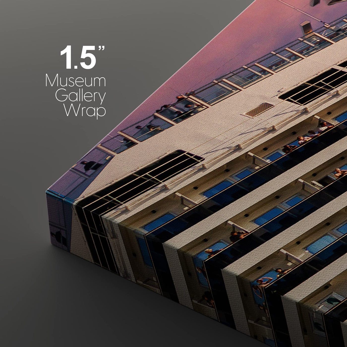 • Q: What style does the Wall26 canvas art depict? A: The Wall26 canvas art features a colorful and scenic seascape of a white cruise ship during sunset, capturing a realistic and nautical theme.