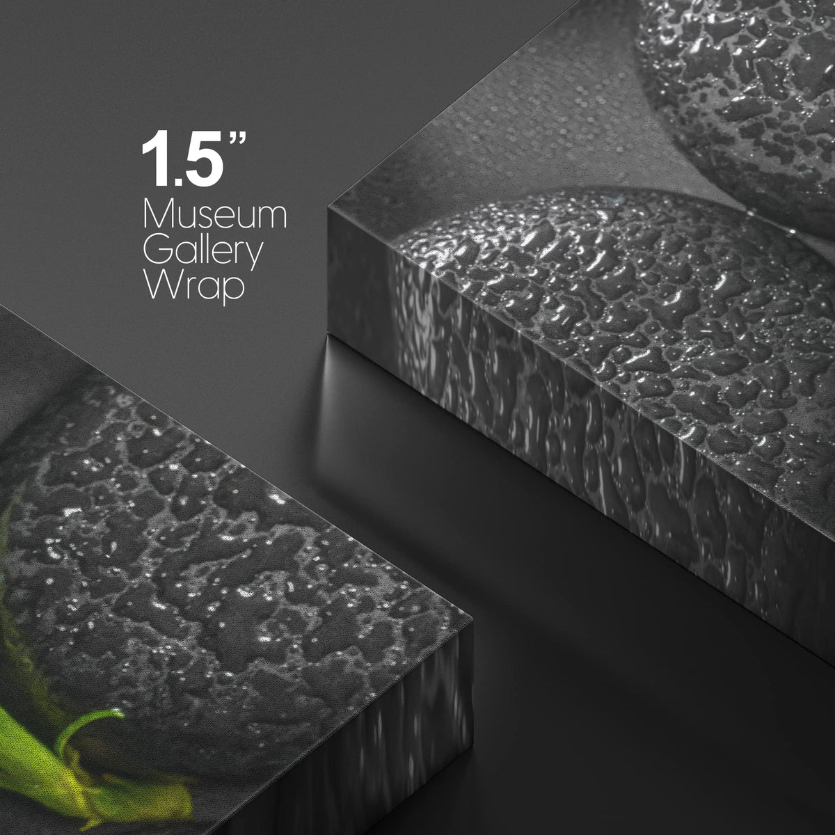 • Q: What is the style of the artwork? A: The artwork features a sprouting green plant over dark black stones, showcasing floral nature photography with a realism bohemian style.