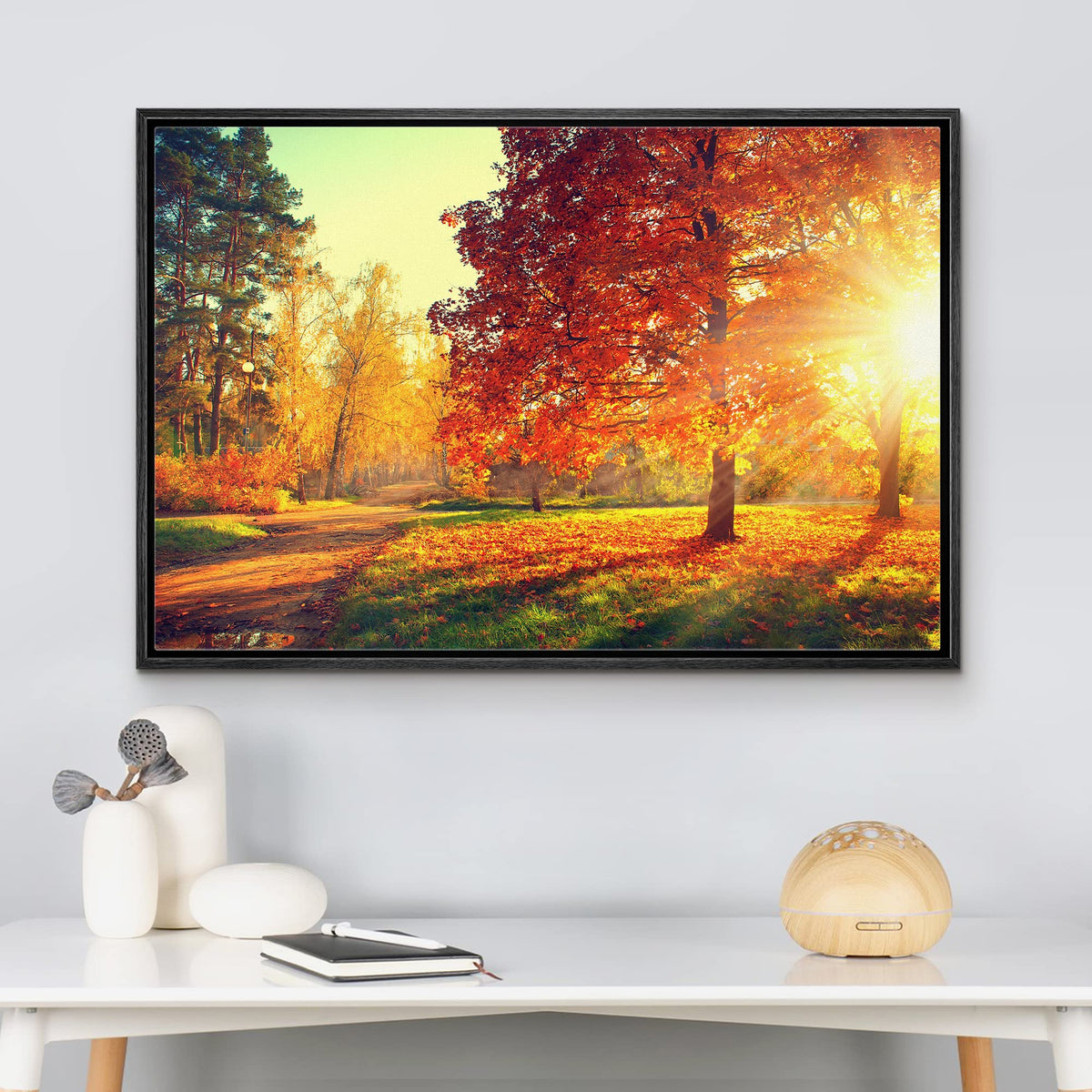 - Q: What themes does this canvas print feature? A: This canvas print features a scenic autumn park theme with vibrant red and orange colors, making it a colorful addition to any room.