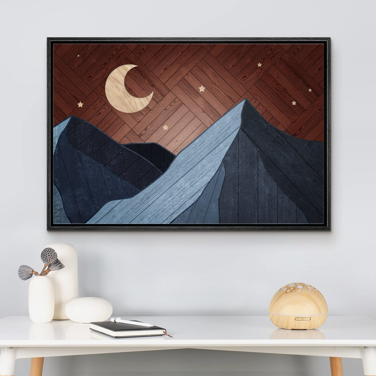 - Q: What style does this canvas print represent? A: This canvas print features a modern art style with a southwestern theme, showcasing a crescent moon and mountain range.