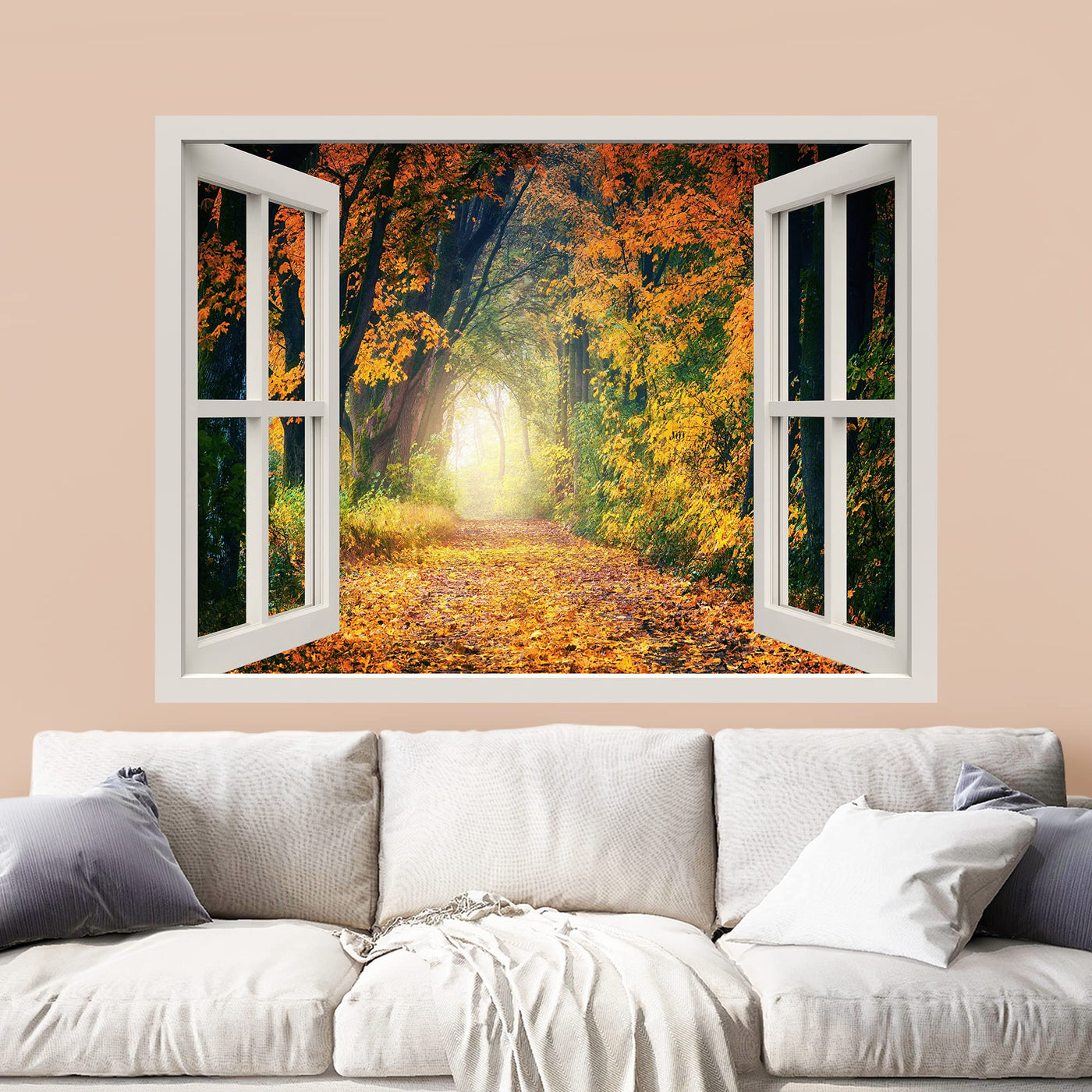 wall26 Removable Wall Sticker/Wall Mural Window View Path Through Autumn Fall Season Tree Forest Nature Wilderness Photography Realism Landscape Multicolor for Living Room Bedroom Office - 24''x32''