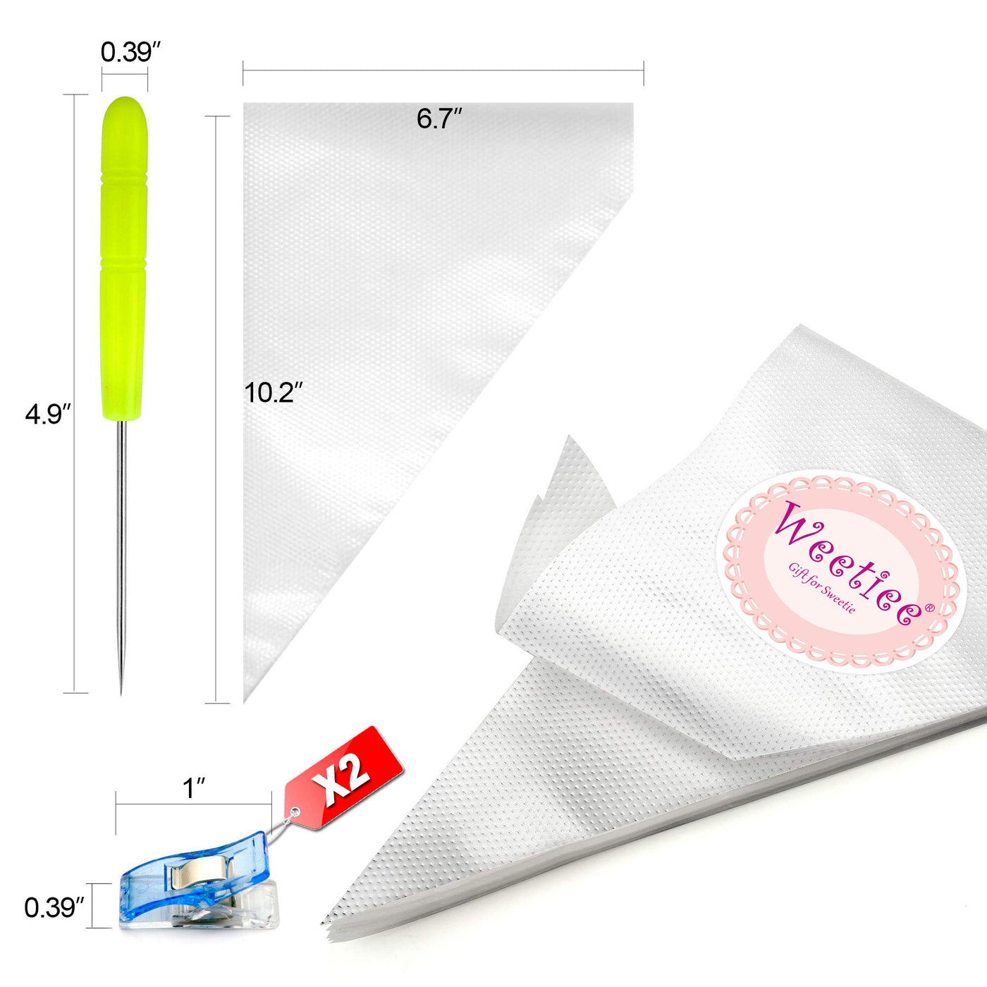 - Q: What are the dimensions of the Weetiee Tipless Piping Bags? A: The Weetiee Tipless Piping Bags are 12 inches long.