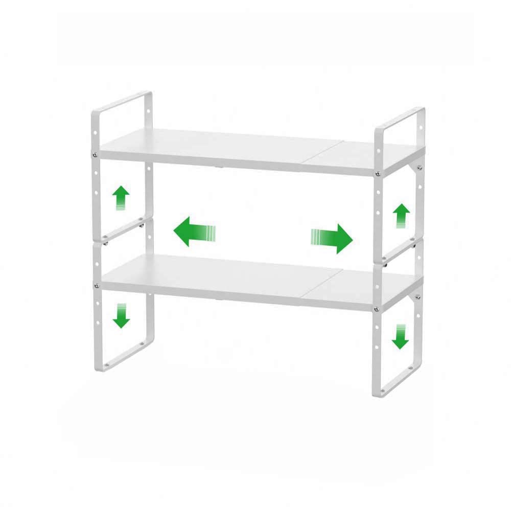 • Q: How does the expandable design help with storage? A: The expandable design allows you to adjust the length of the shelves from 16.54 inches to 27.17 inches, helping you save space and store more items efficiently.