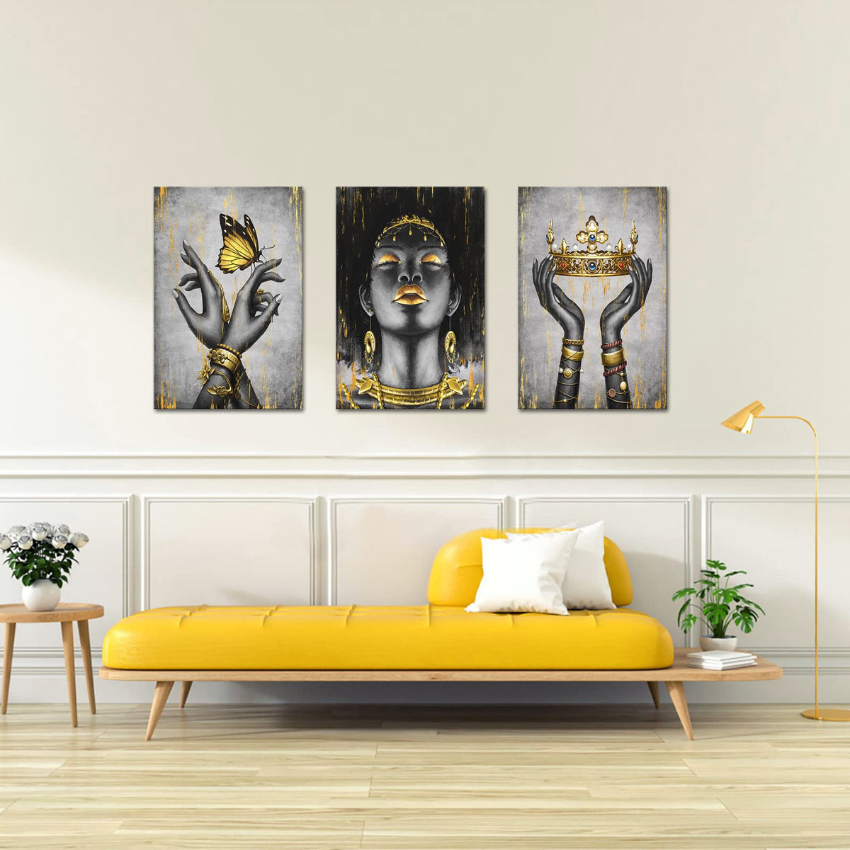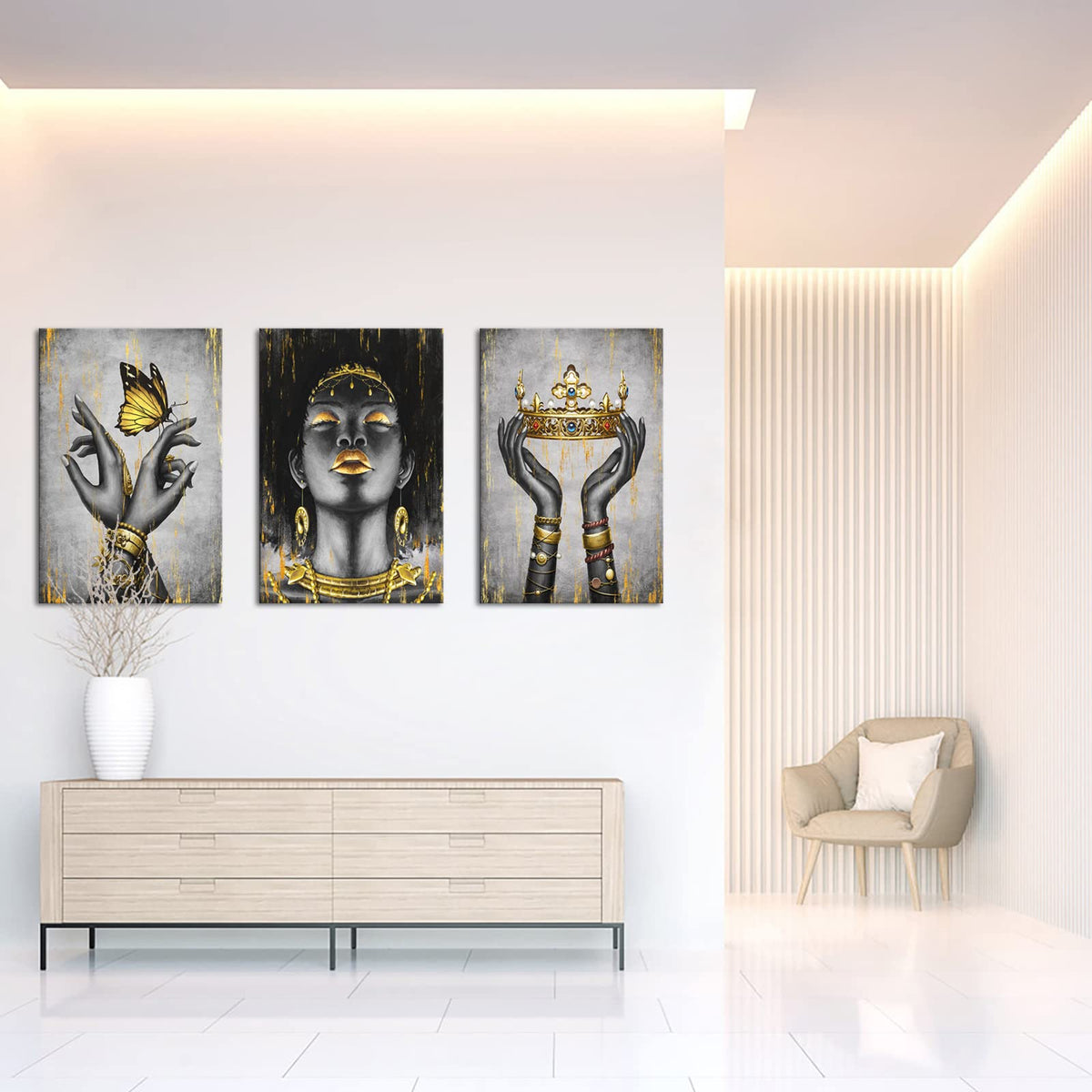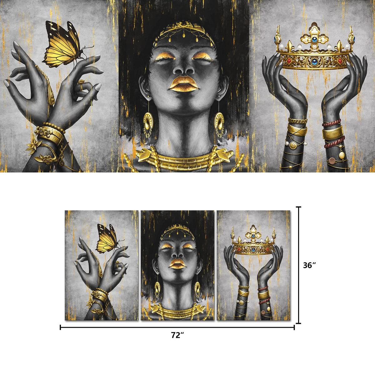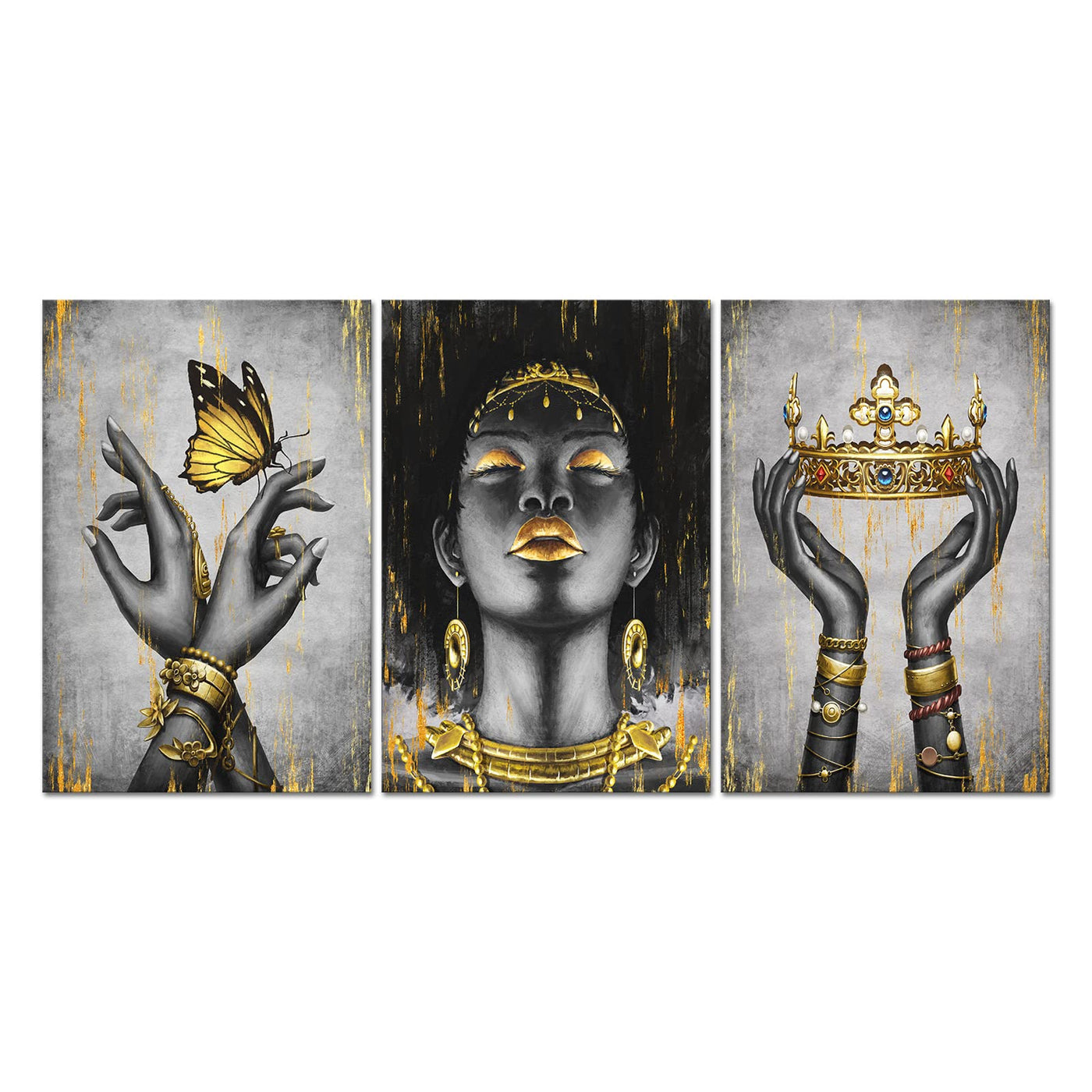 Welmeco African American Cavnas Wall Art Elegant Black Woman With Gold Necklace Crown Butterfly Painting Fashion Charming Woman