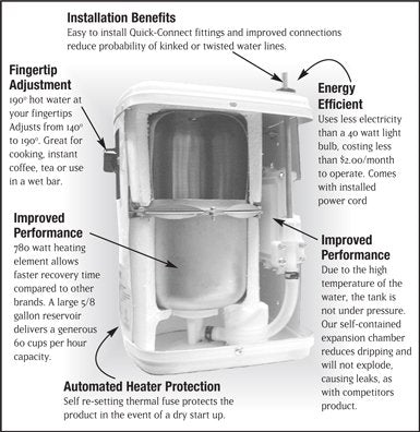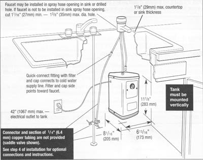 • Q: What type of water tank is compatible with this faucet? A: This faucet requires a quick heating water tank, specifically the QHT-1PV model, which is sold separately.