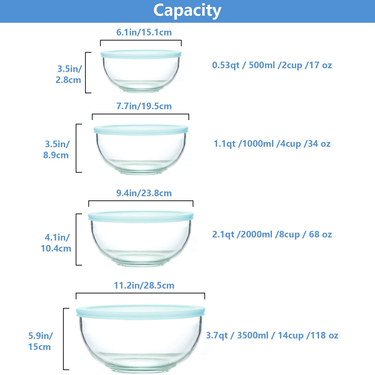 - Q: What sizes are included in the WhiteRhino glass bowls set? A: The WhiteRhino glass bowls set includes four sizes: 3.7 quarts (3500ml), 2.1 quarts (2000ml), 1.1 quarts (1000ml), and 0.53 quarts (500ml).