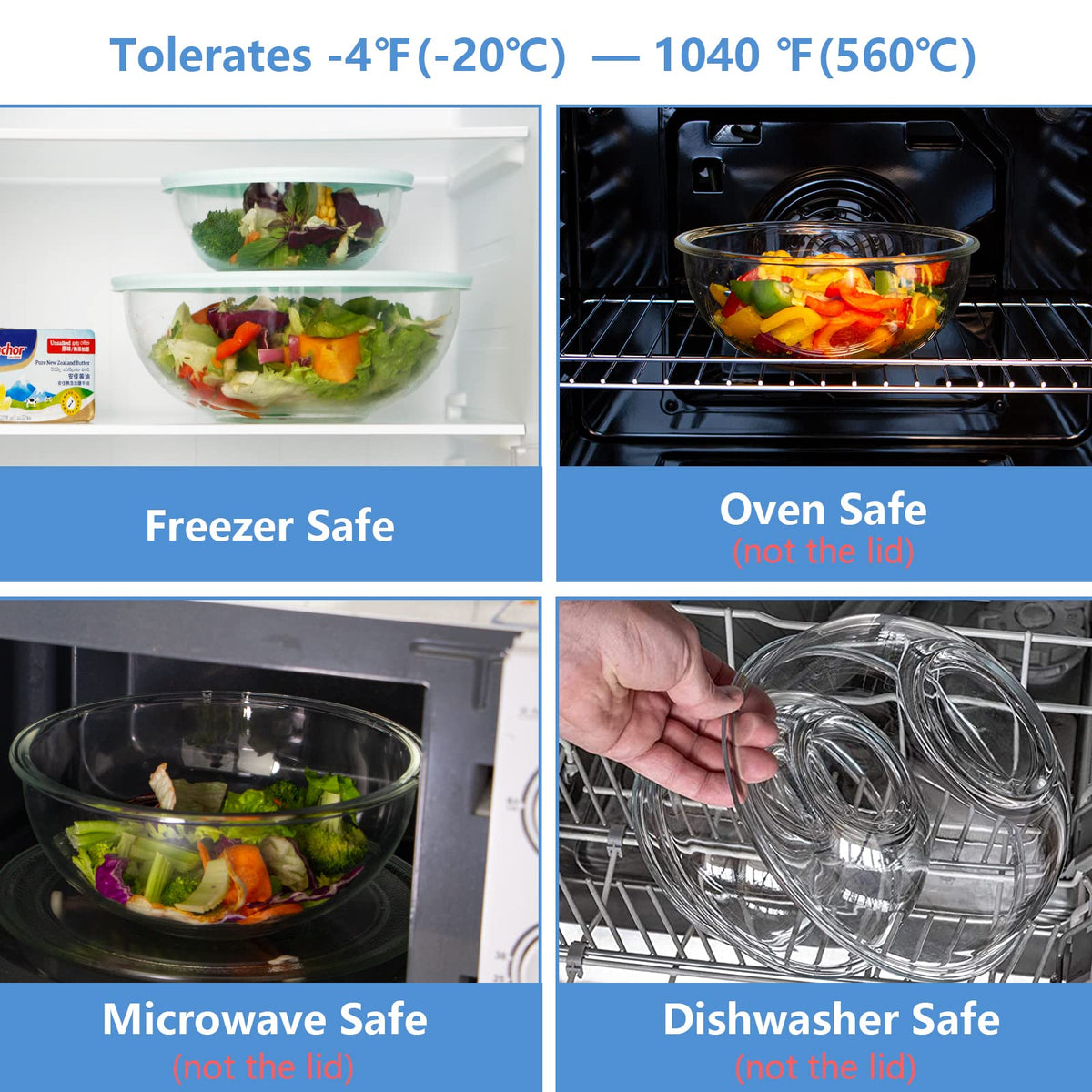 - Q: Can I use these bowls in the microwave or oven? A: Yes, the bowls are heat-resistant and can be used in both the microwave and oven, but please note that the lids are not microwave or oven safe.
