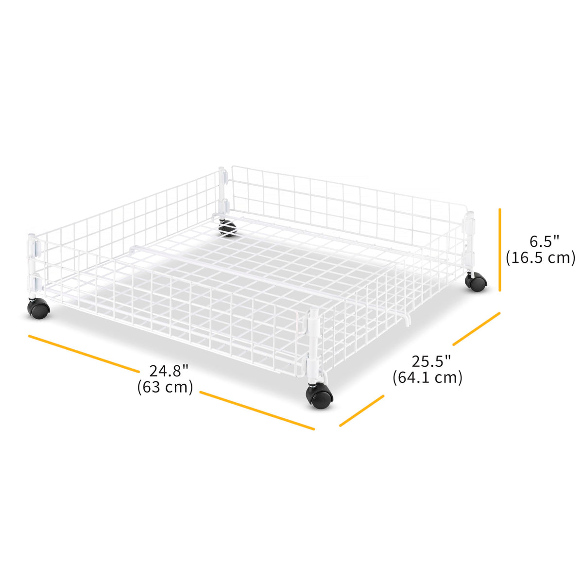 • Q: What are the dimensions of the Whitmor Rolling White Wire Underbed Cart? A: The assembled dimensions of the cart are 24.8 inches in length, 25.25 inches in width, and 6.5 inches in height.