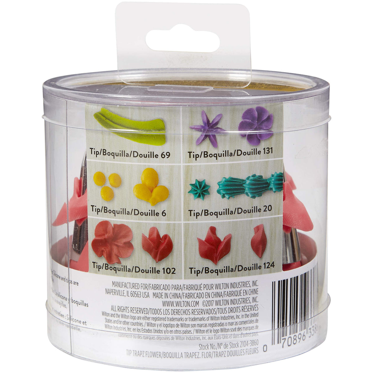 • Q: What is included in the Wilton Flower Piping Tip Set? A: The set includes 6 metal decorating tips and 1 silicone stand for convenient storage and washing.