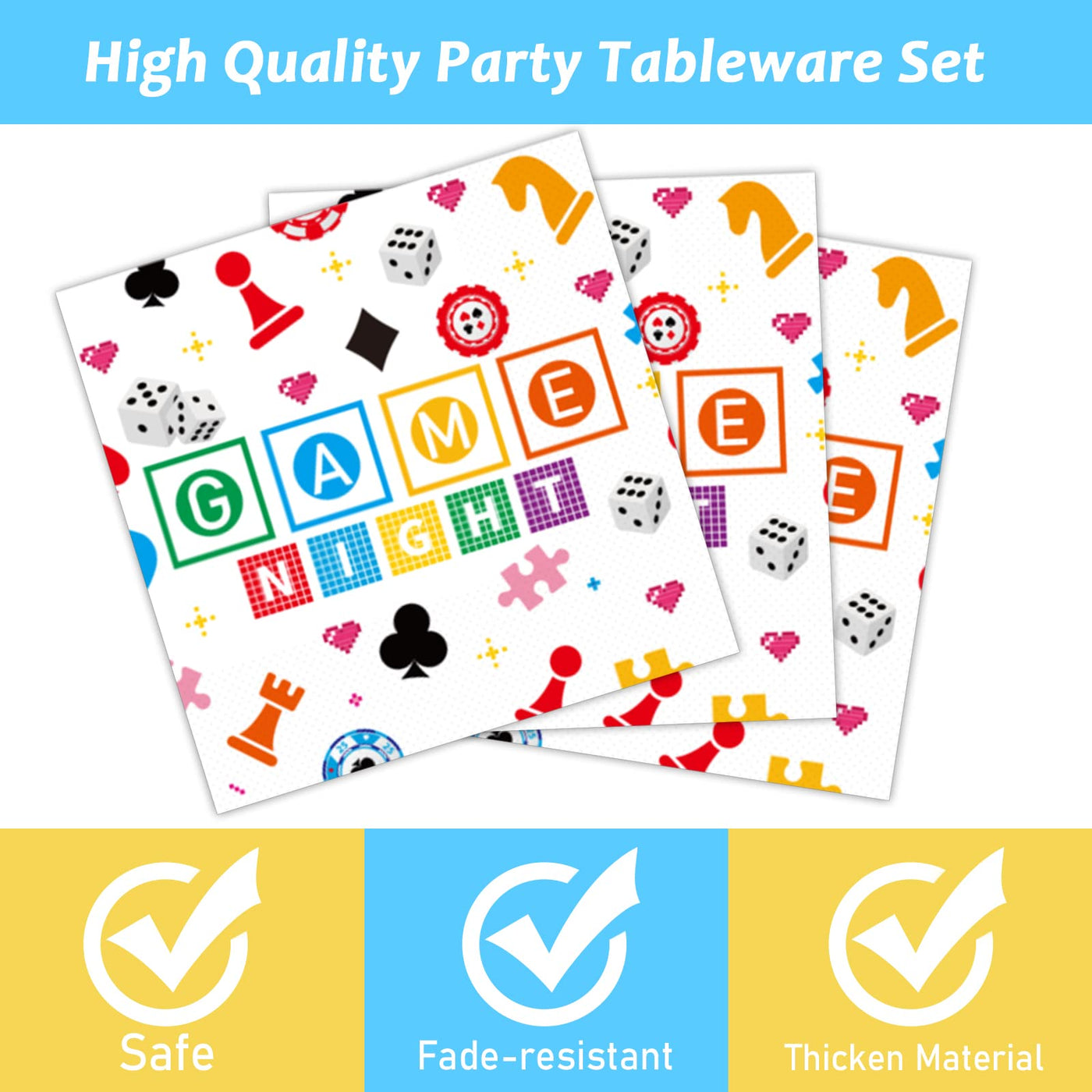 • Q: How can I use these supplies for my party? A: You can use these supplies to set up a colorful and themed table setting for your Game Night party, enhancing the festive atmosphere for your guests.