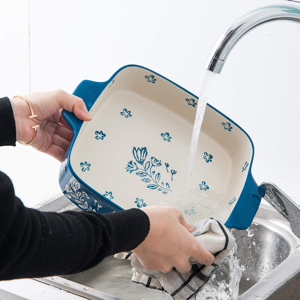 • Q: Does this baking dish have any special design features? A: Yes, it features a unique flower pattern design and bright color that adds a charming decoration to your table and kitchen.