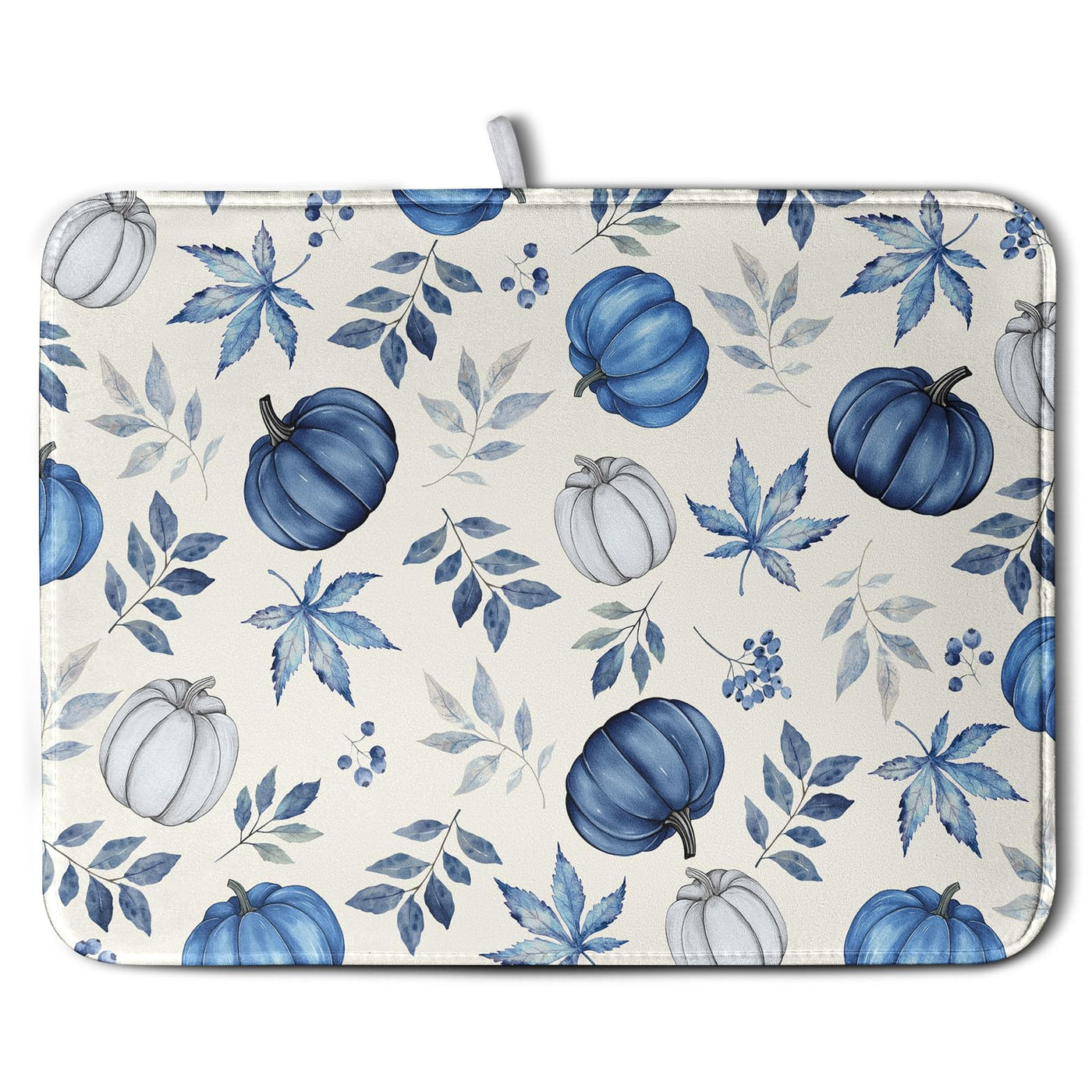 Wnoesat Fall Dish Drying Mat Blue Pumpkin Maple Leaves Drying Mats for Kitchen Counter 18x24 Inch Autumn Thanksgiving Absorbent