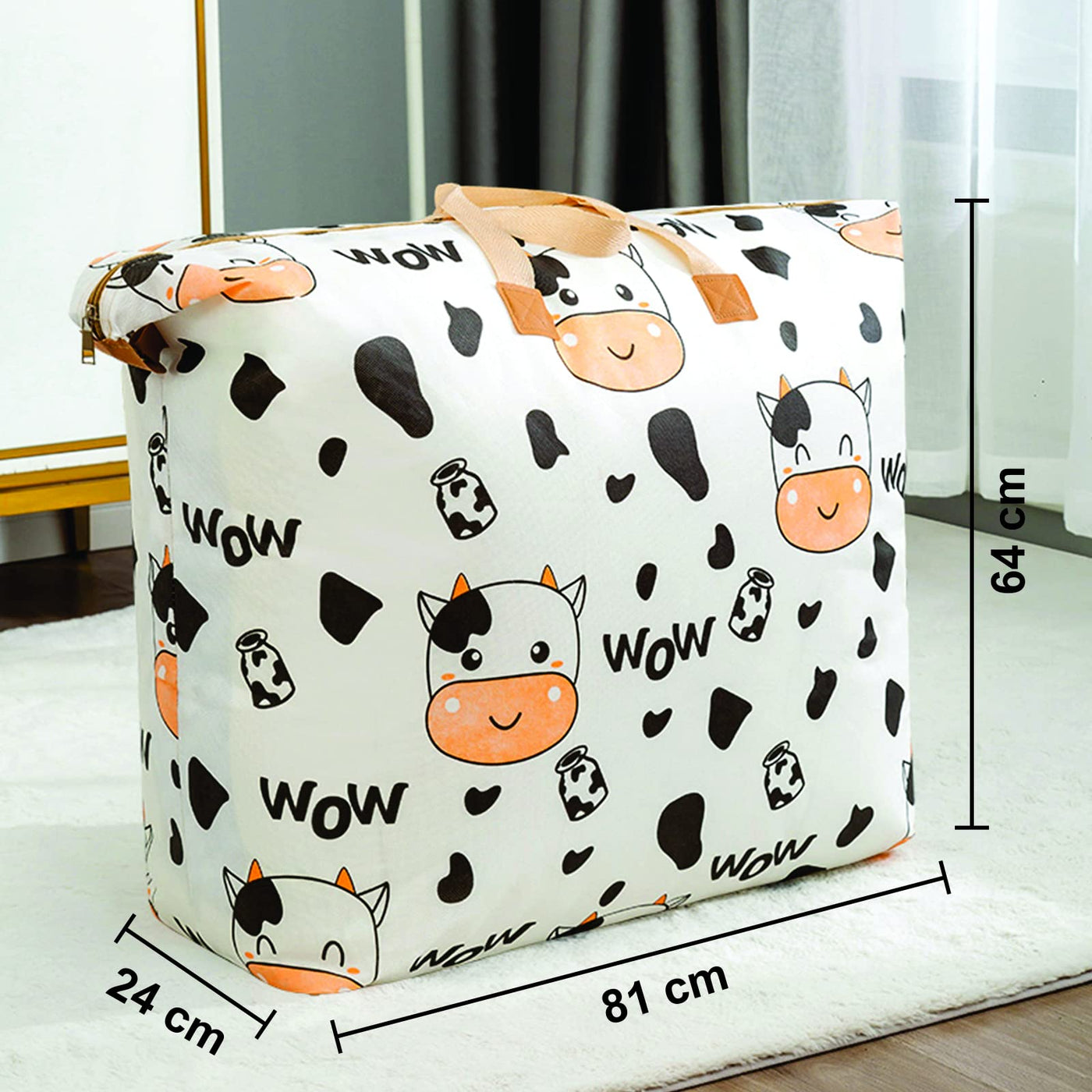 Wolpin Non-Woven Extra Large Size Underbed Storage Bag Waterproof (81 X 24 X 64 Cm) - Zippered Closure & Handle Cow Print, Recta