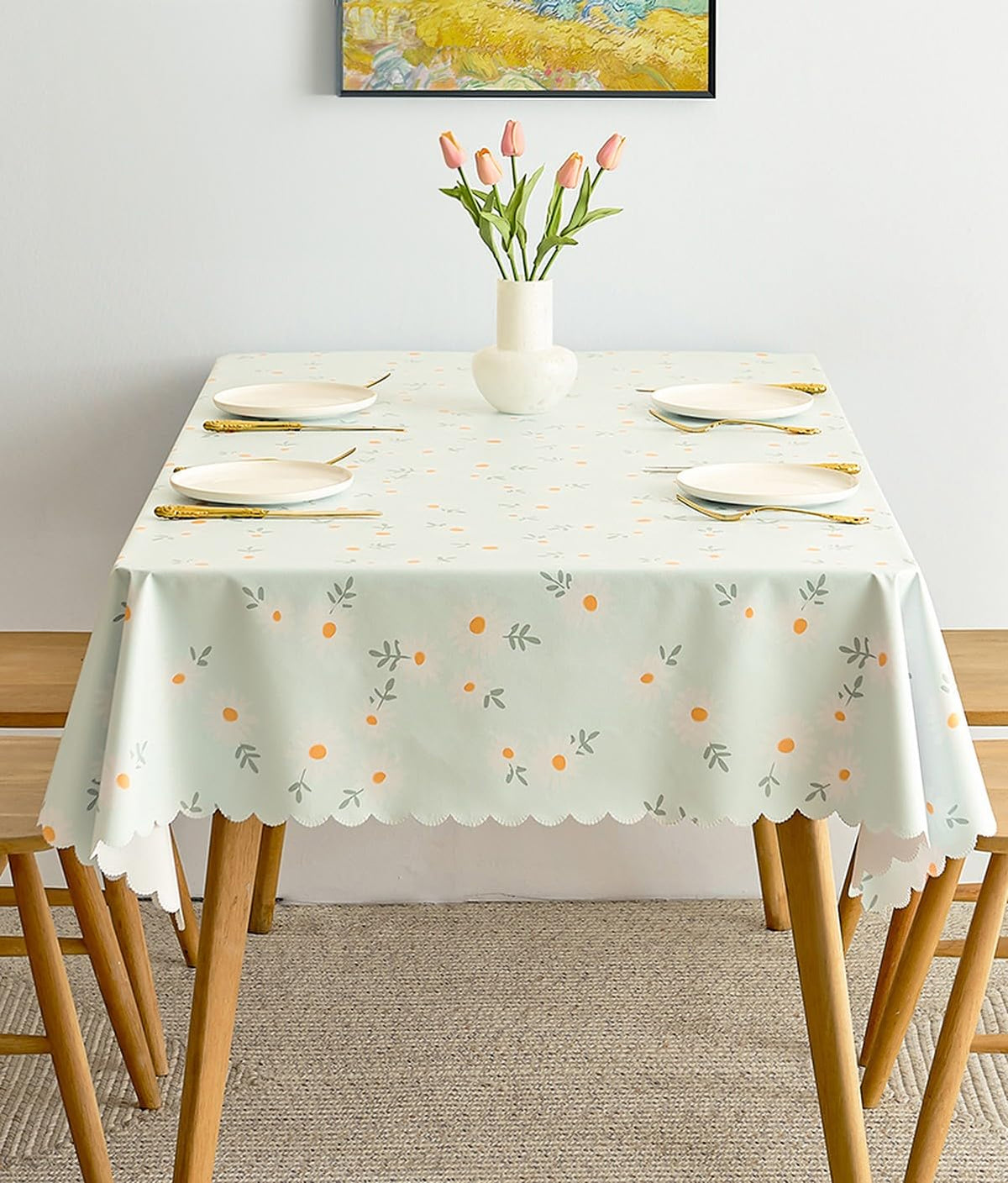 Wolpin Polyvinyl Chloride Pvc Dining Rectangular Table Cover & 4 Seater Center Table Cloth - Green Daisy Flower Print Oil Proof, Waterproof