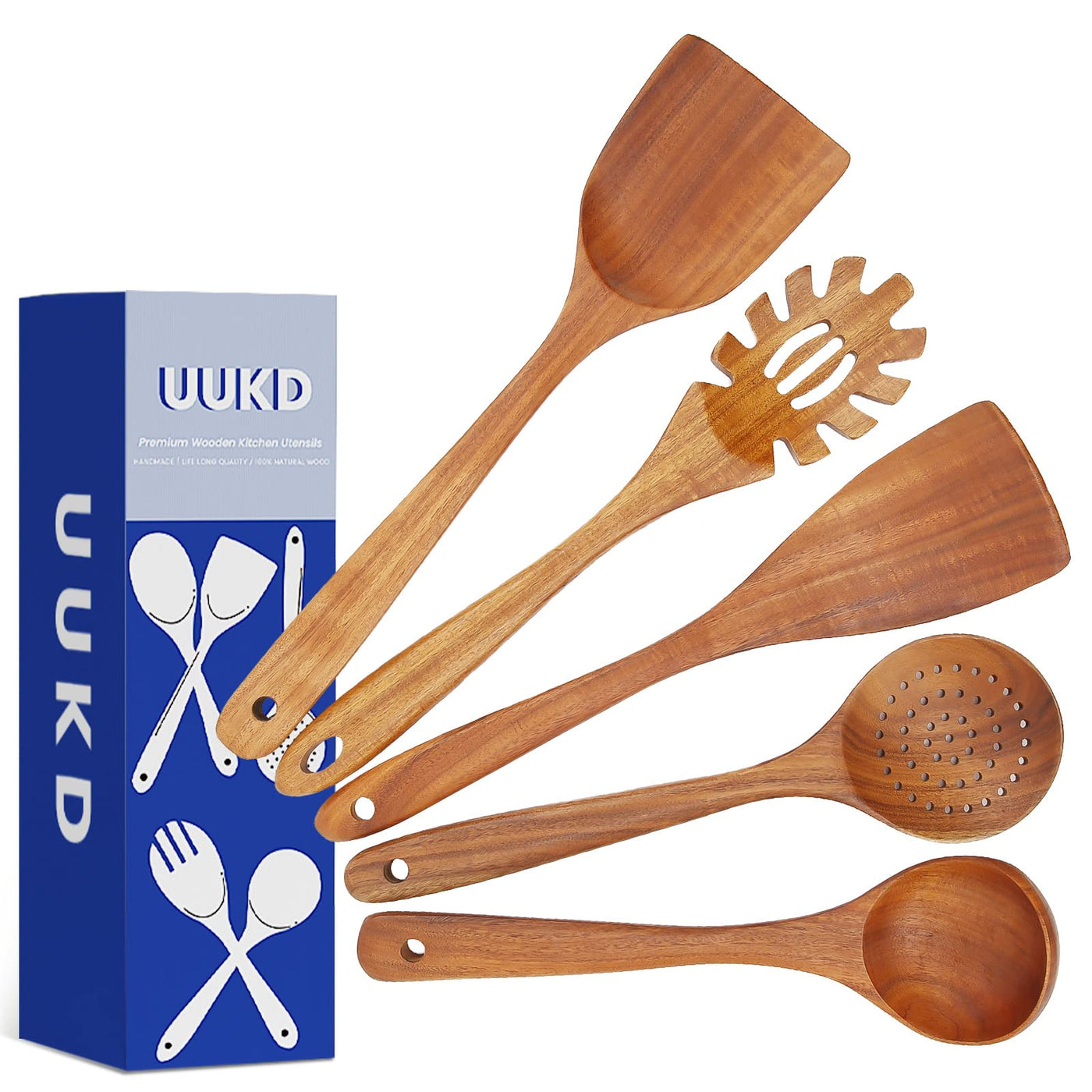 - Q: What is included in the Wooden Kitchen Utensil Set? A: The set includes a spaghetti server, fried spatula, normal spatula, soup ladle, and filter spoon.