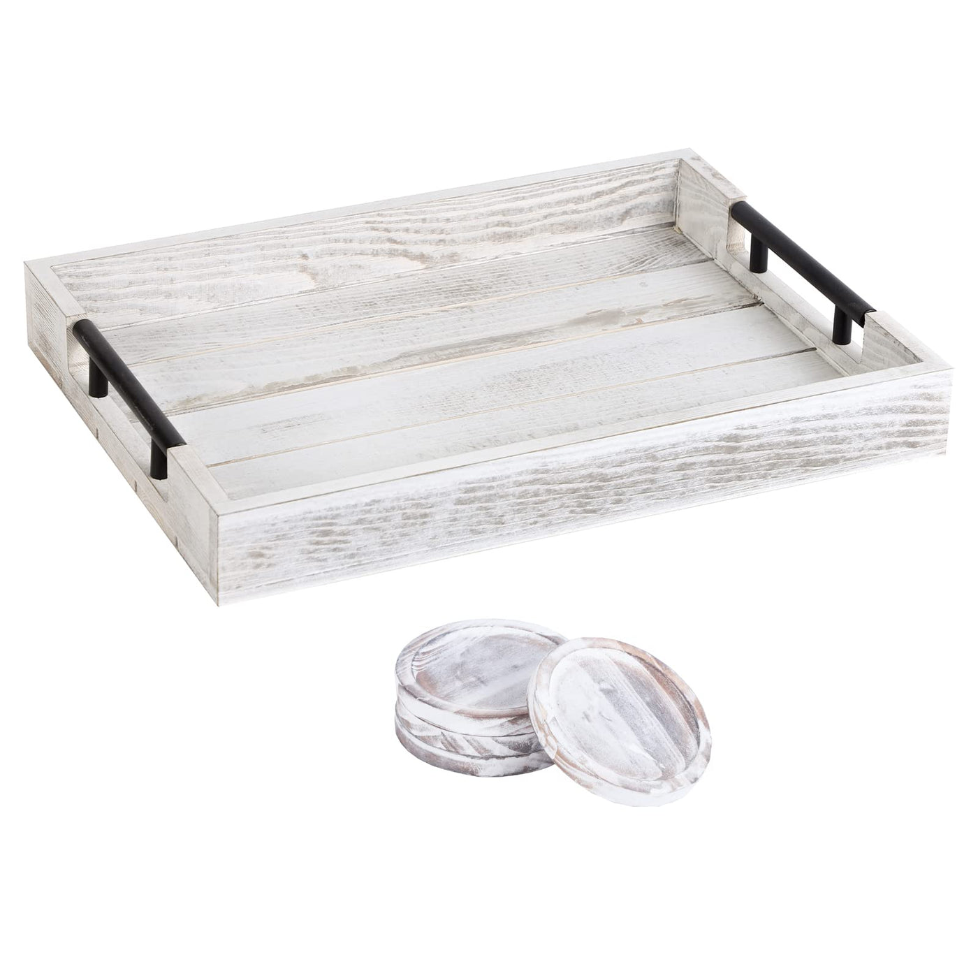 • Q: Does the tray come with coasters? A: Yes, the Wooden Serving Ottoman Tray includes four coasters as part of the package.