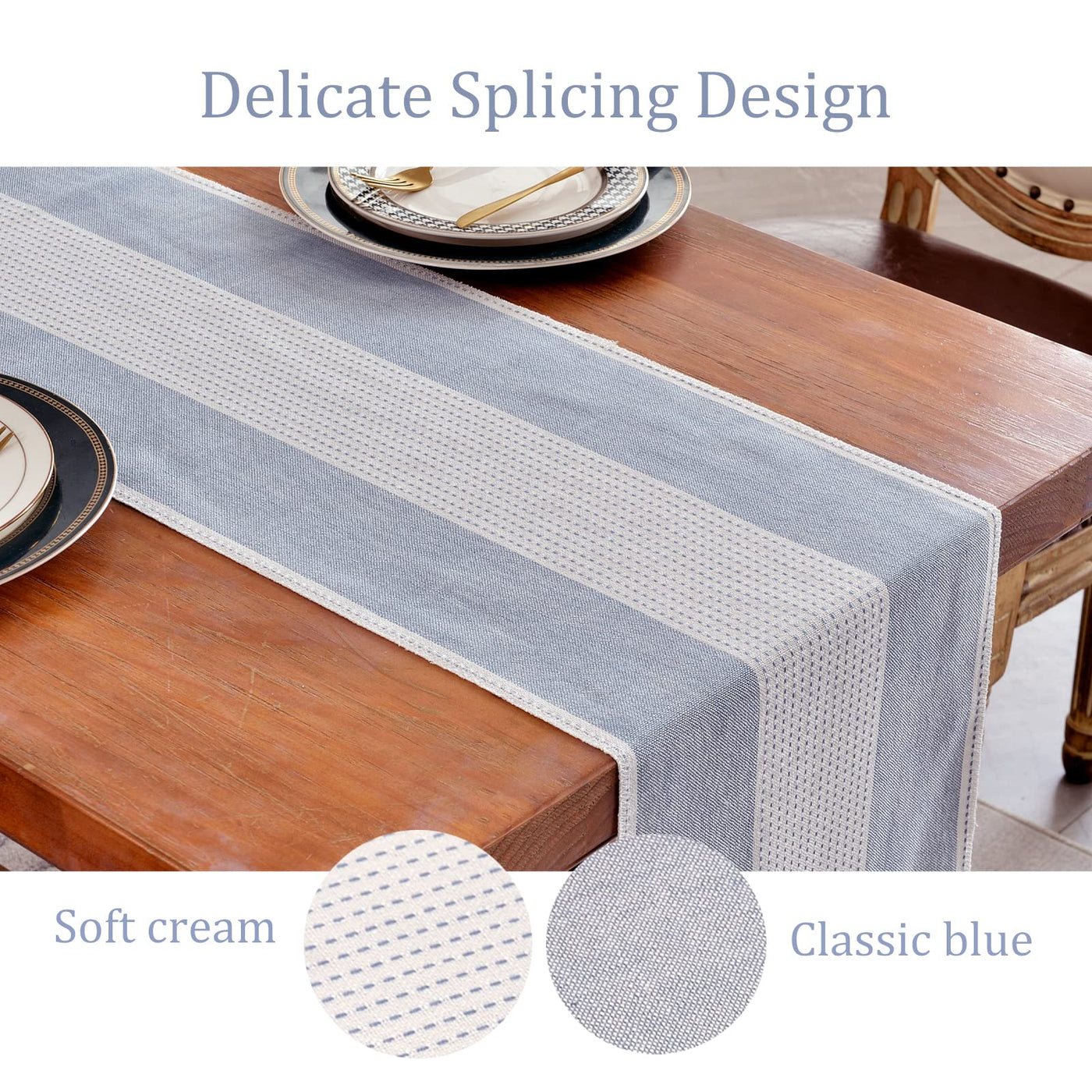 - Q: Does the table runner have any special design features? A: Yes, it features delicate splicing designs with a mix of soft cream and classic blue, chic handmade fringe, and a simple pattern macrame, which adds elegance and charm.