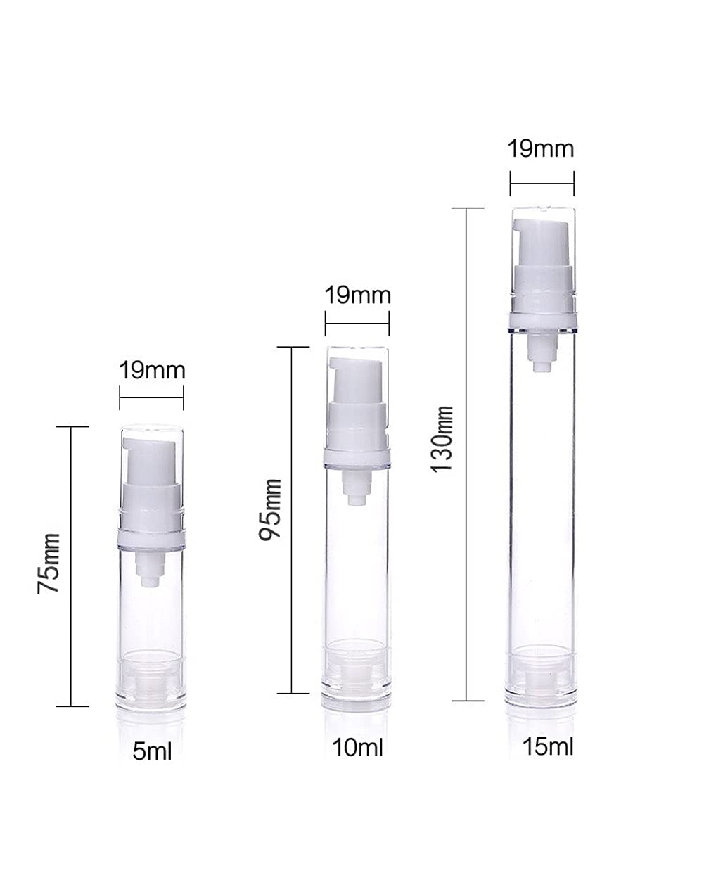 - Q: What are the different sizes of the lotion bottles available? A: The lotion bottles are available in three sizes: 5 milliliters, 10 milliliters, and 15 milliliters, with dimensions of 19 millimeters by 75 millimeters, 19 millimeters by 95 millimeters, and 19 millimeters by 130 millimeters respectively.