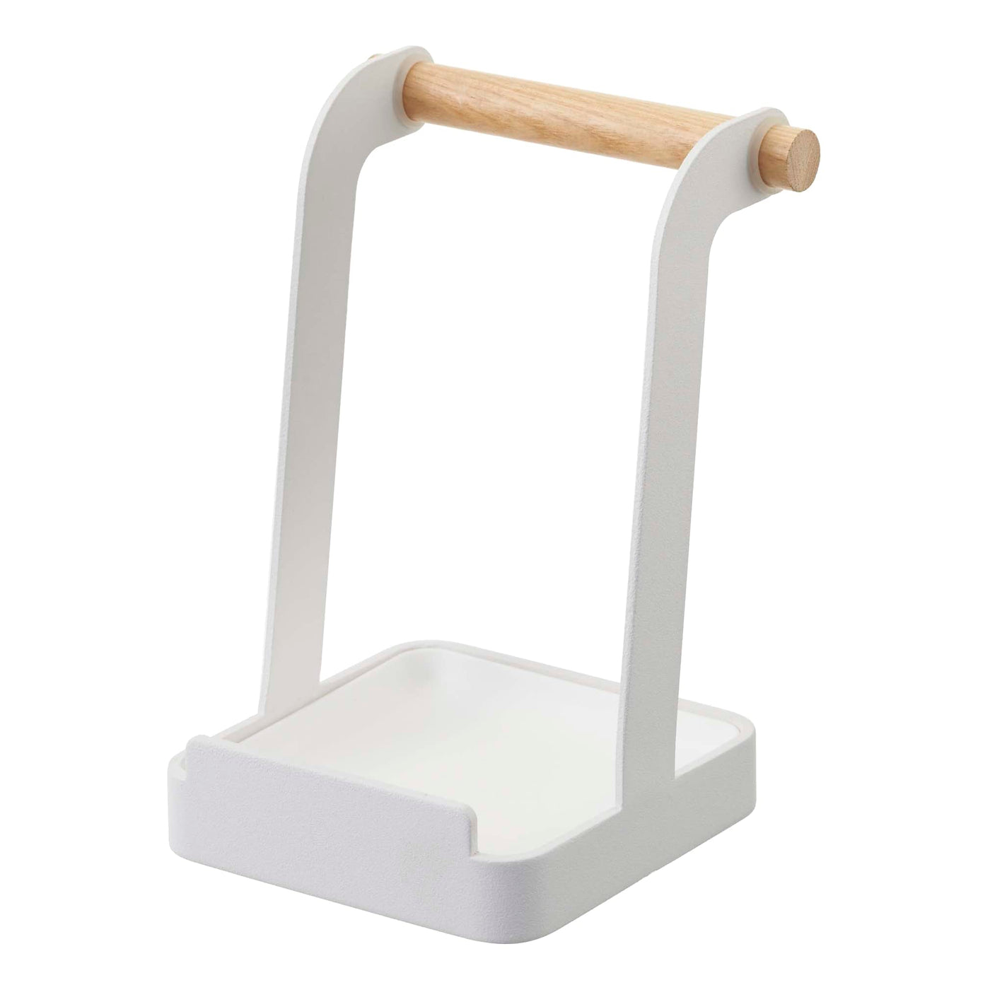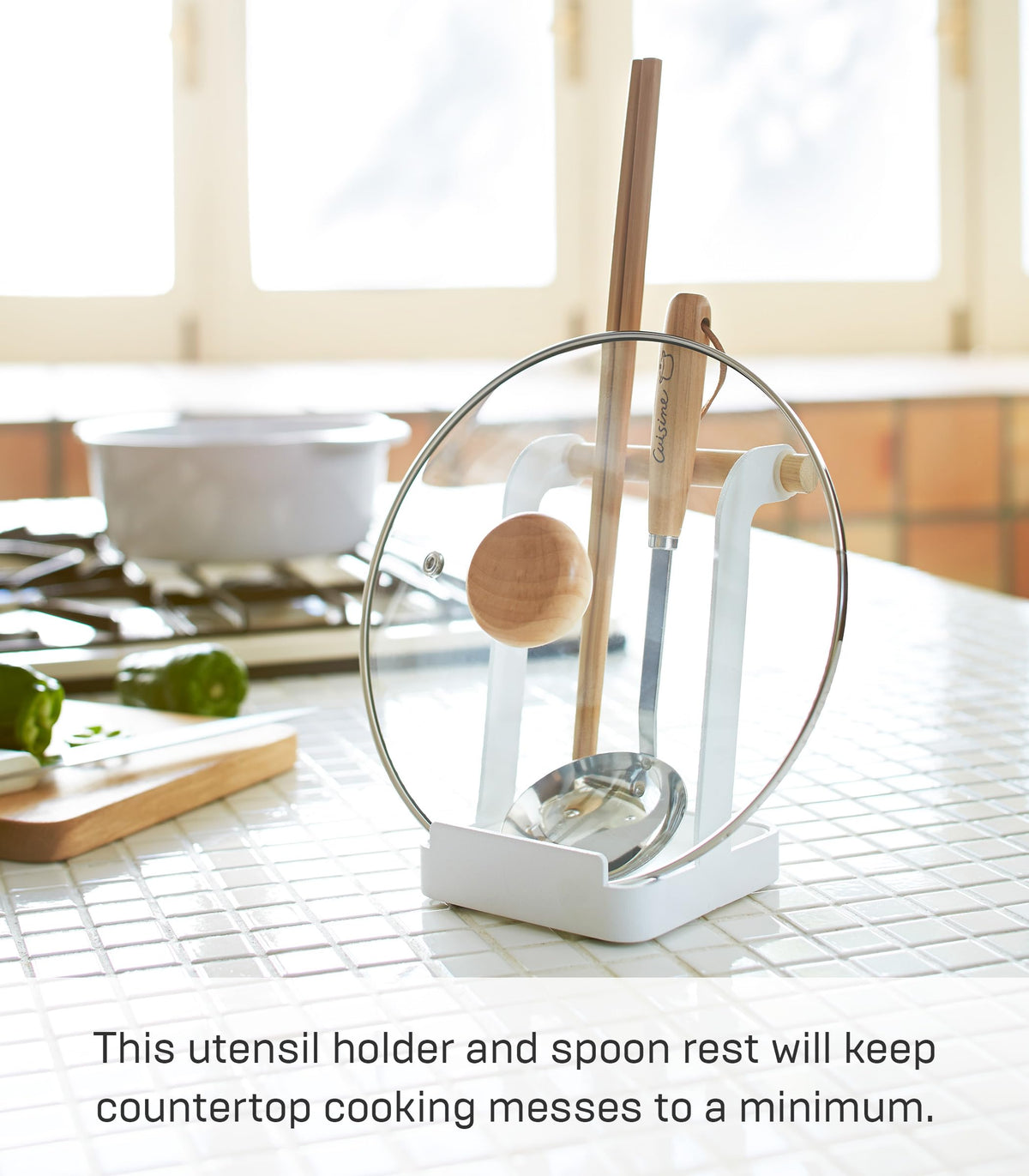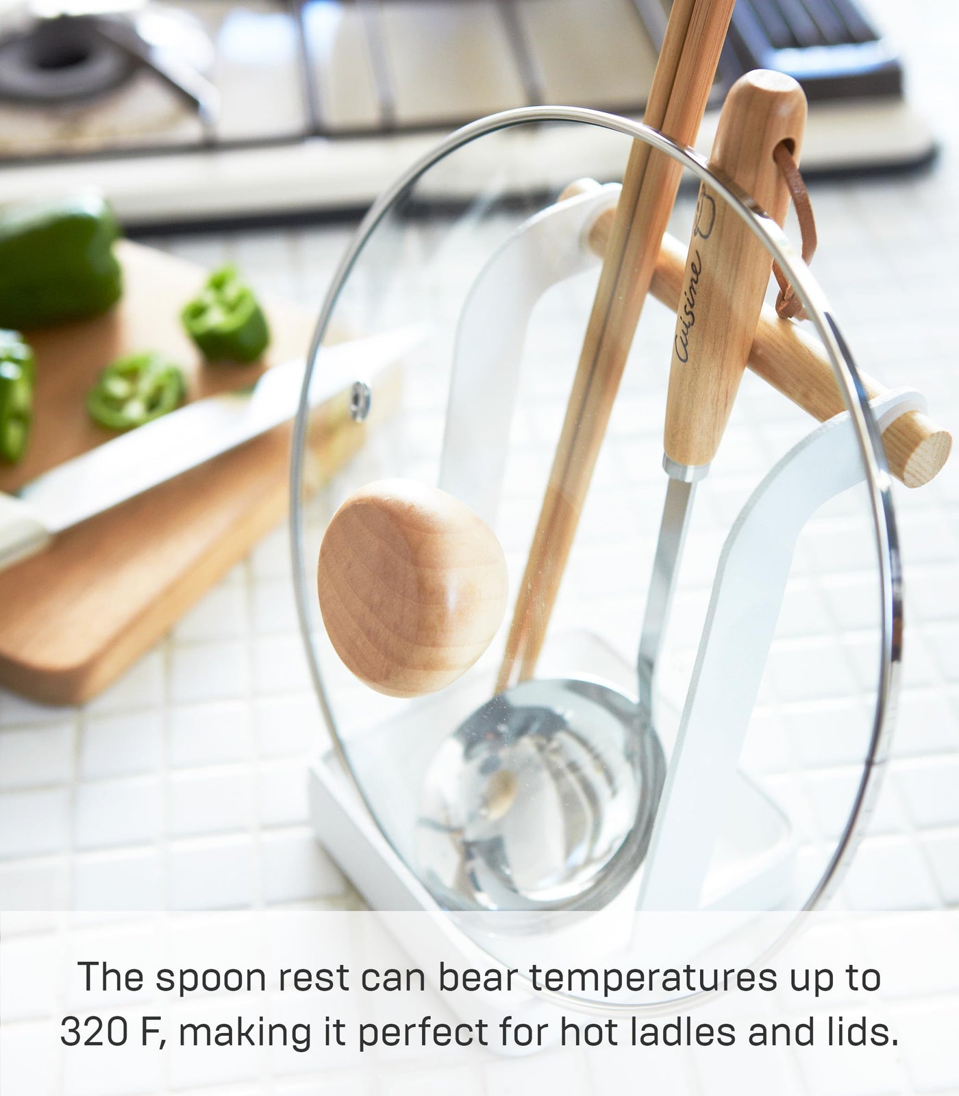 Yamazaki Home Ladle & Lid Rest - Kitchen Utensil Organizer Stand For Cooking Steel + Wood White