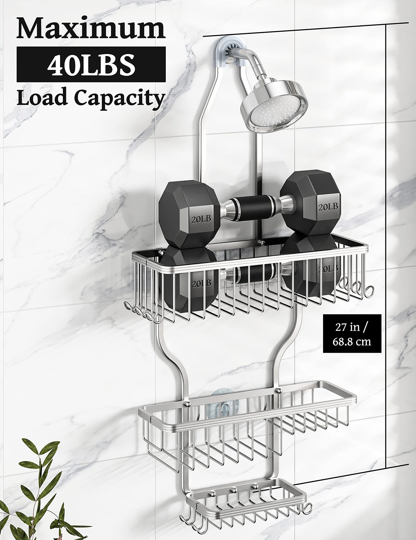 Yasonic Hanging Shower Caddy Over Shower Head With 10 Hooks For Razor/Sponge, Soap Basket Never Rust Aluminum, Large - Silver