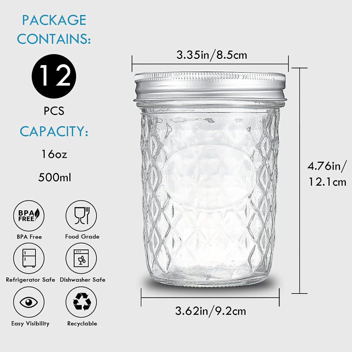 Yeboda 16 Oz Mason Jars Wide Mouth Canning Jars 12 Pack Glass Jars With Silver Metal Airtight Lids And Bands For Jam, Honey, Wed