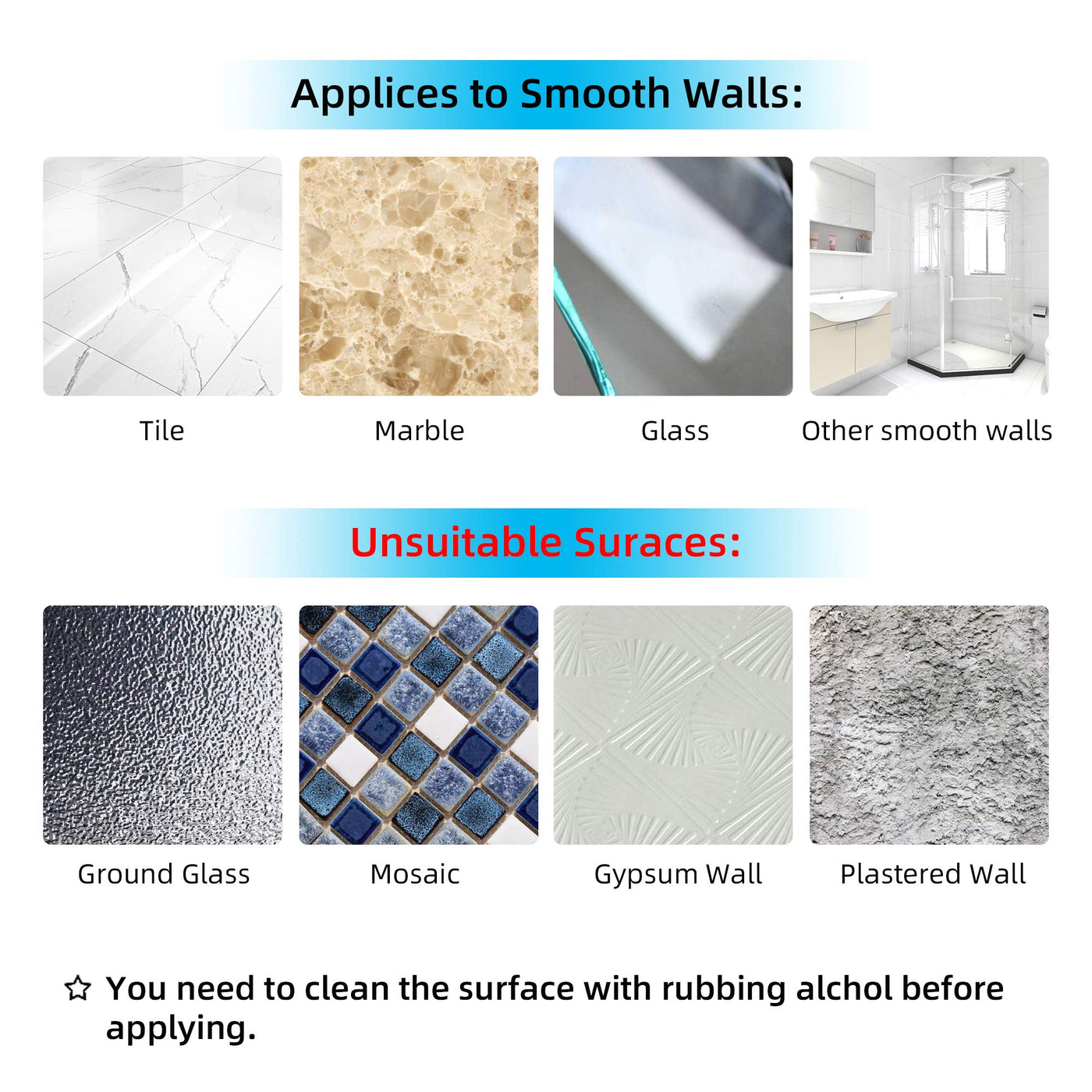 - Q: What surfaces are these suction cups compatible with? A: These suction cups are compatible with smooth surfaces such as tiles, marble, glass, and all smooth-walled surfaces.