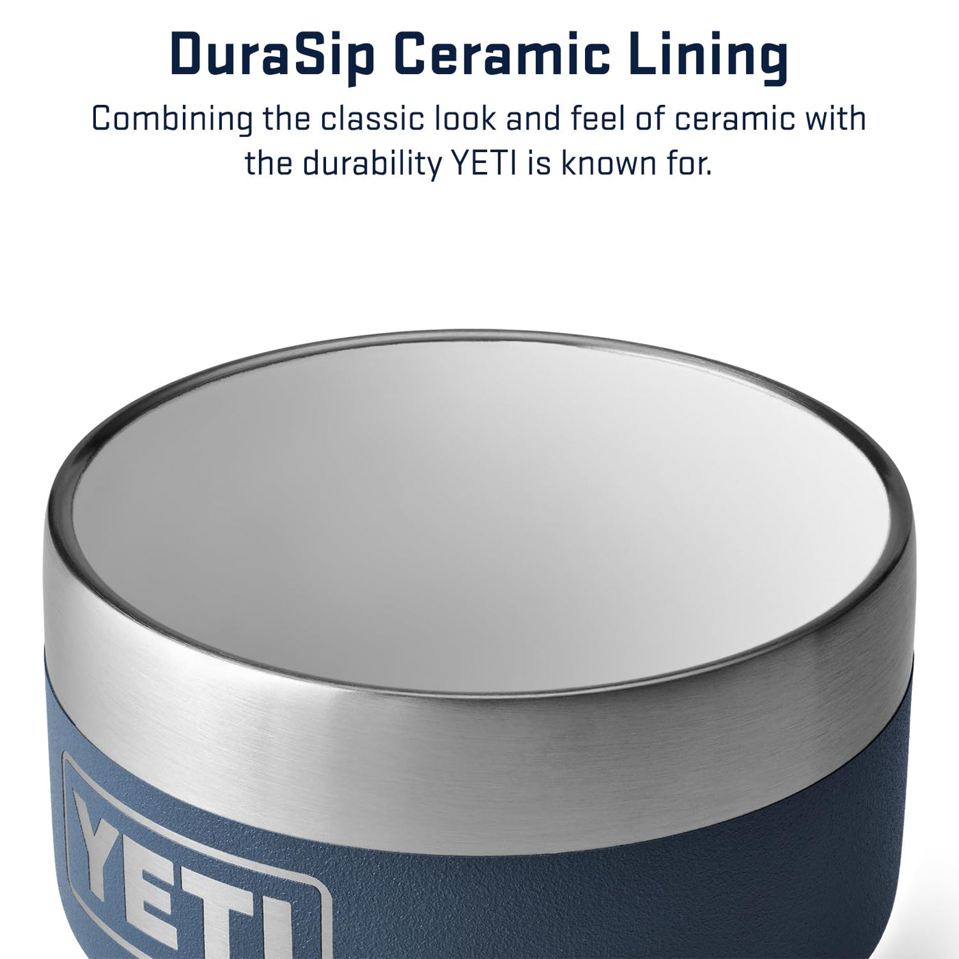 - Q: What material is the YETI Rambler Stackable Cup made from? A: The cup features a DuraSip Ceramic Lining that is fused with 18/8 vacuum insulated stainless steel for durability and a classic feel.