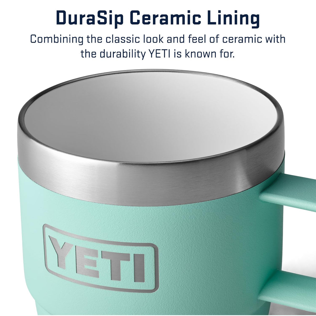 - Q: What colors are available for the YETI Rambler Stackable Mug? A: The YETI Rambler Stackable Mug is available in several colors, including Seafoam.