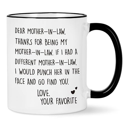 - Q: What kind of design does the mug feature? A: The mug features a humorous design with the words 'Dear mother in law, thanks for being my mother in law...' printed on both sides.