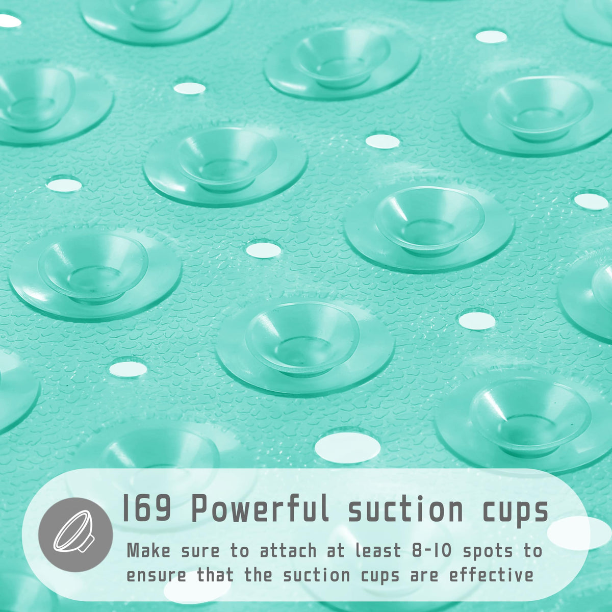 • Q: How effective are the suction cups on this mat? A: The mat features 169 large suction cups designed to provide strong adhesion on smooth, clean surfaces, preventing slipping during use.