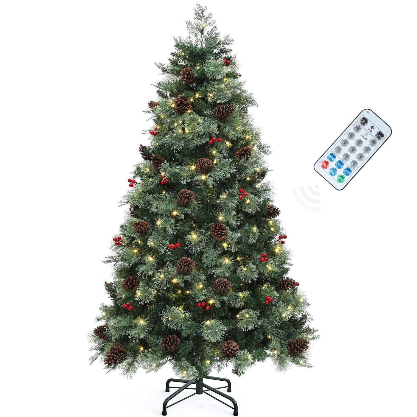 Pre-Decorated Carolina Pine Christmas Tree: Bring the charm of a winter woodland into your home with the YITAHOME 6ft pre-lit and pre-decorated Carolina Pine Christmas tree; This Prelit Christmas Tree with Remote features 720 mixed PVC tips, 36 pine cones, 30 red berries, and lush lifelike pine needles for a full, realistic look | Upgraded Control with Remote: Easily adjust the lights, modes, timers and brightness of your prelit green Christmas tree with the included remote; Simply aim at the light switch within 13 ft for effortless operation; The remote is sensitive, just click, change, and enjoy | Adjustable Lighting for Every Vibe: With just one click, choose from 3 lighting colors including warm white, vibrant multi-color, and a warm multi-color blend, along with 11 dynamic modes to easily switch from cozy family nights to lively festive parties | Easy Assembly: Our pre-decorated Christmas tree features a hinged structure that allows the branches to automatic fall into place, minimizing the time and effort required for setup; The tree can be disassembled into 3 parts for compact storage after the holidays | Durable Materials: Built to last with an X-shaped iron stand and reinforced base; This holiday decor offers strong branches that support multiple ornaments while maintaining a sturdy structure, making it a reliable addition to your Christmas celebrations