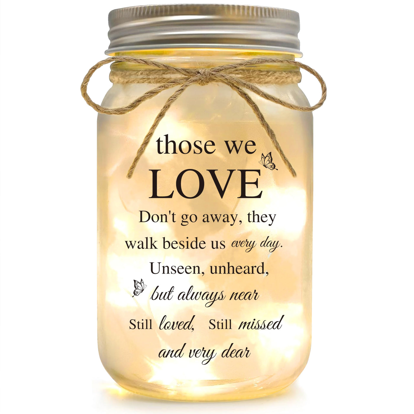 Bereavement Gifts:A warm designed Sentimental Memorial Gift for the Lost of a Loved - Our loved never leave, they are with us every day. Unseen, unheard, but always in our heart, it is a wonderful sympathy gift. Product Details: Thickened glass bottle Unique Design: The warm words printed on the jar are perfect for decorating your space, while the warm LED lights add a cozy touch. Size: The Size is 10 x 10 x 16 cm Includes: 1 mason jar decor, and 1 light string with 20 lights (battery not included)