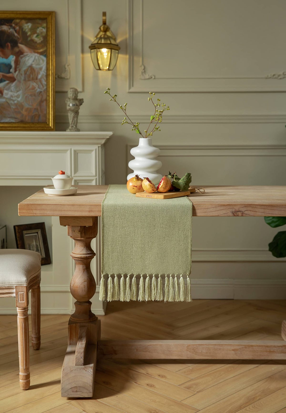 - Q: What style is the ZeeMart Sage Green Table Runner? A: The table runner features a rustic farmhouse style, with a burlap woven surface and a luxurious satin texture on the back, adding elegance and charm to your home decor.