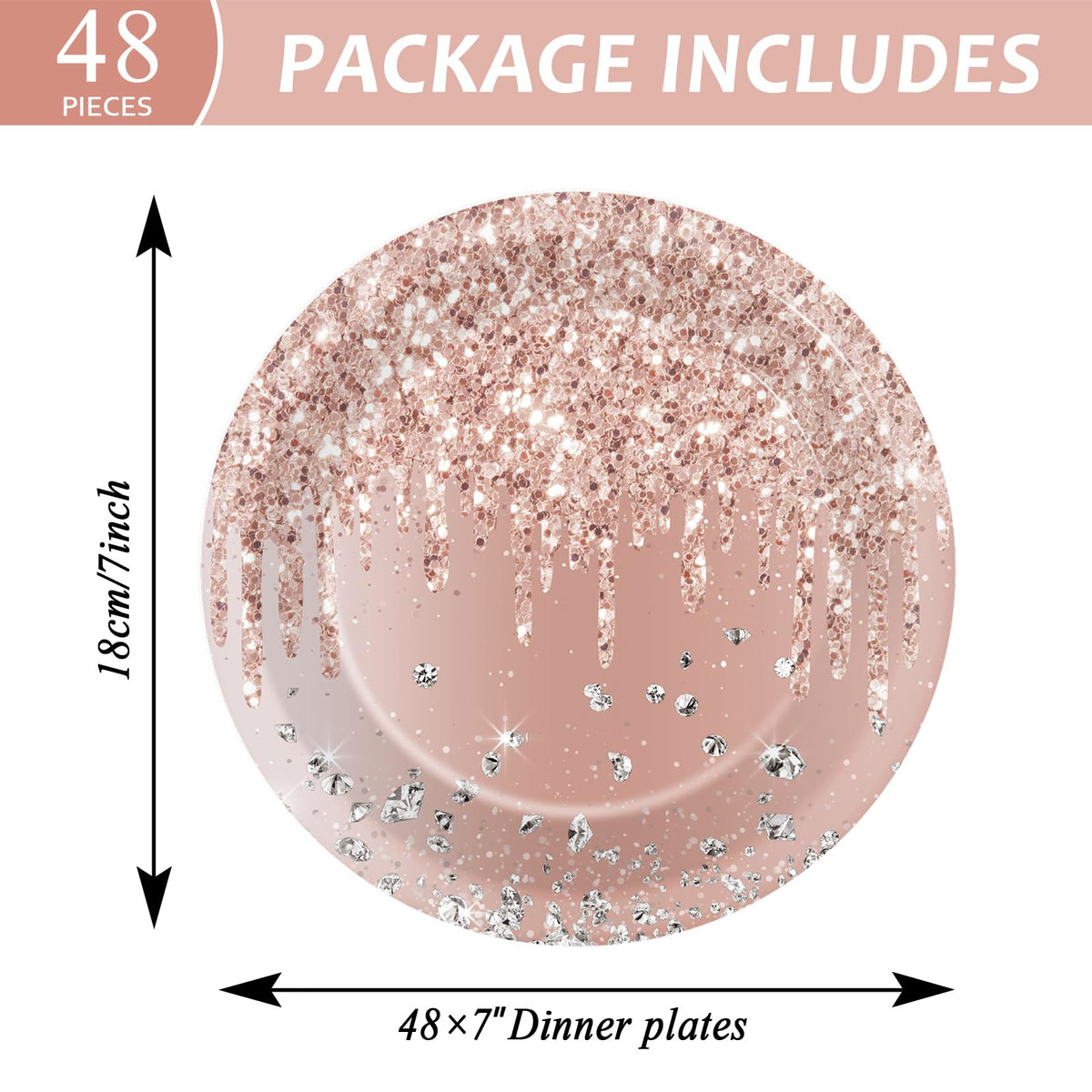 • Q: What is included in the package? A: The package includes 48 disposable pink rose gold plates, each measuring about 7 inches by 7 inches.