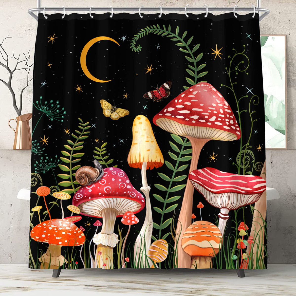 - Q: What is the design theme of the shower curtain? A: The shower curtain features a unique design with a mushroom and plant theme, incorporating black and red colors.