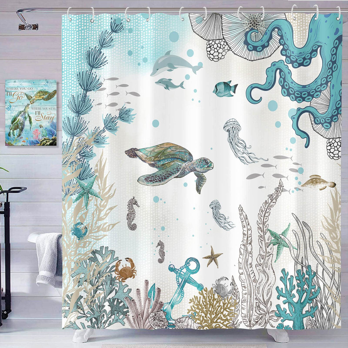 Zussun Long Sea Turtle Octopus Shower Curtain Blue Teal Waterproof Fabric Bathroom Shower Curtains Fish Ocean Animal Seashell Je