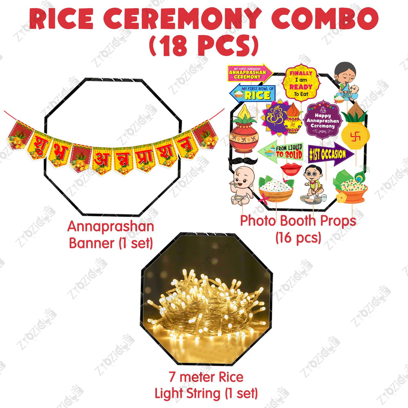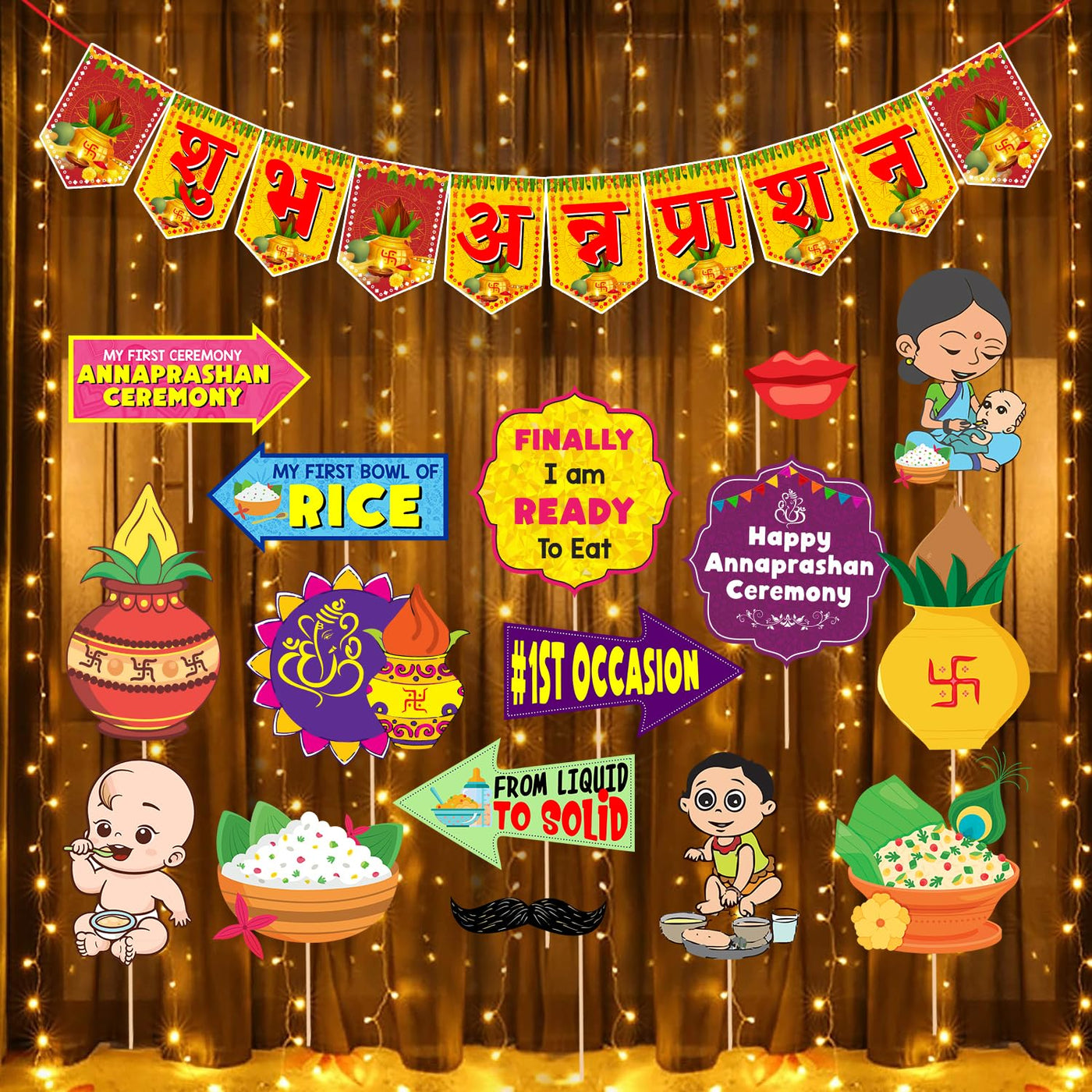 Zyozique Annaprasanam Photo Booth Props With Annaprasanam Paper Bunting Paper Banner Hindi Font Shubh Annaprashan | Rice Ceremony Decorations Items (Pack Of 18)